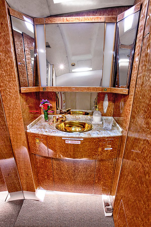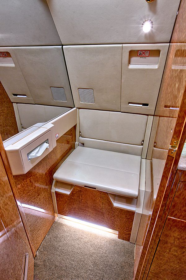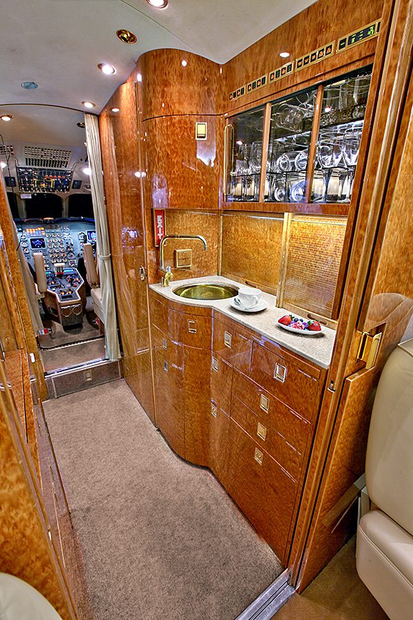 14 Passenger interior. Forward four club VIP arrangement, mid cabin four club w/conference table, fold away seat, two aft three place sofas. Airshow 400, microwave, AM/FM/CD player, forward and aft lavs. Pop up seat in credenza – completed June 2009. Exterior: Overall White with Gray and Blue Stripes