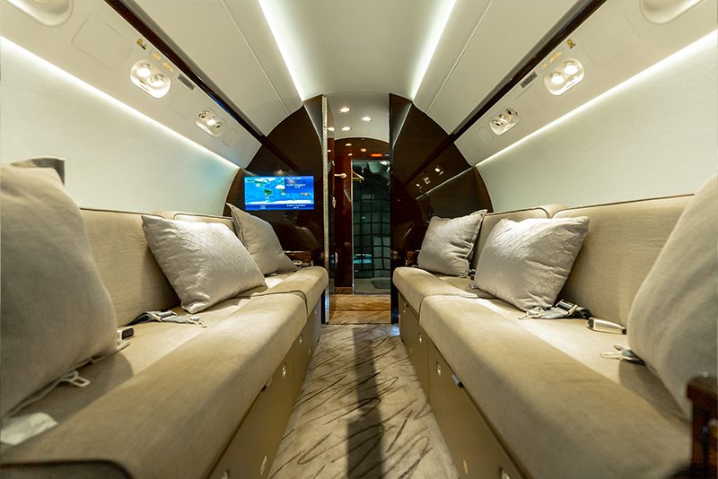 The interior boasts the more popular layout including fwd galley and crew rest area, 4 fwd club chairs, center 4 place conference area with table and two rear birth able couches with privacy partitions. 24” aft bulkhead monitor, 19” fwd LCD monitor and 9” LCD monitors within armrests of each single passenger seats.