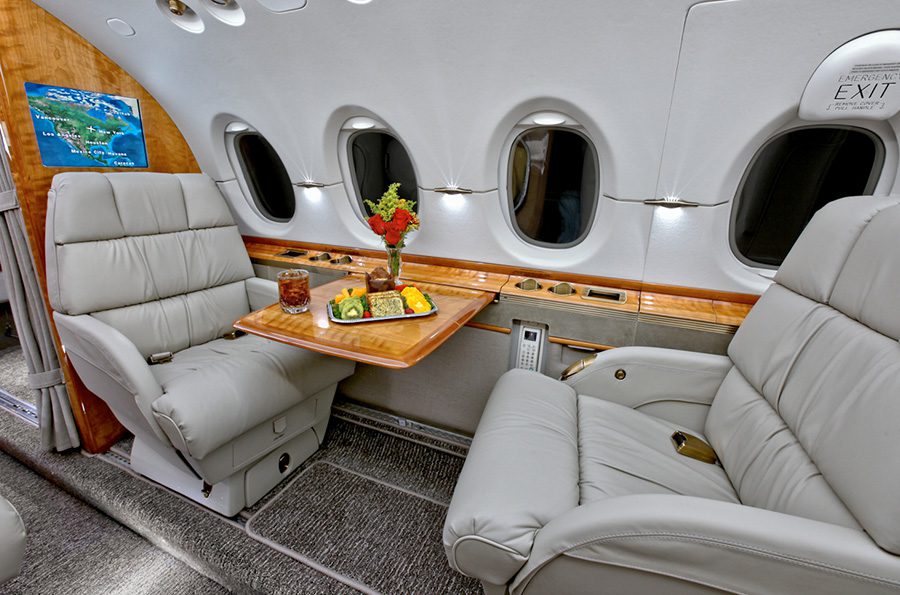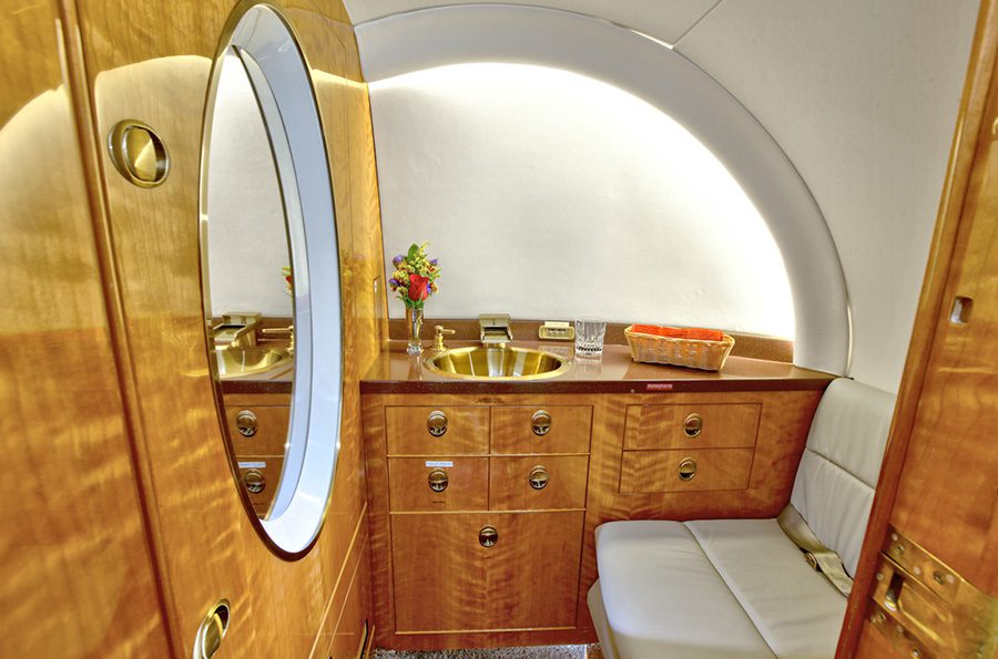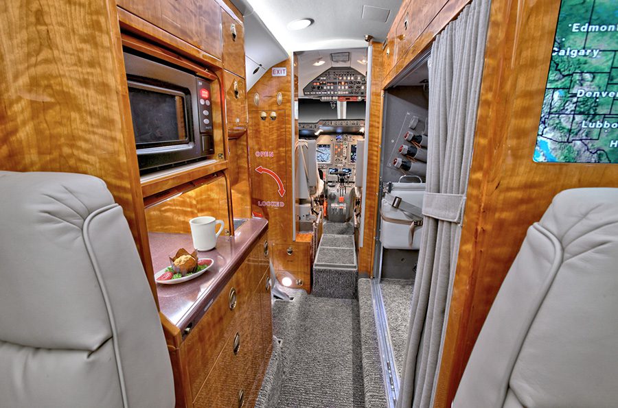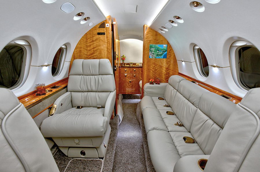 Nine (9) passenger configuration including belted lavatory. Entering the aircraft is the forward baggage area on the right hand side immediately across from the main entrance door. Aft of the entrance door is the galley equipped with microwave, an ice drawer, and various storage compartments for galley and cabin supplies. Moving aft into the cabin is a four (4) place club followed by a three (3) place divan on the left hand side opposing one (1) forward facing seat on the right hand side. Aft of the cabin seating is the lavatory that includes one (1) left hand belted seat that is externally serviced.