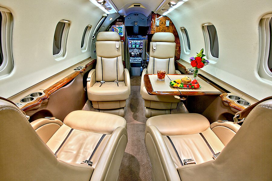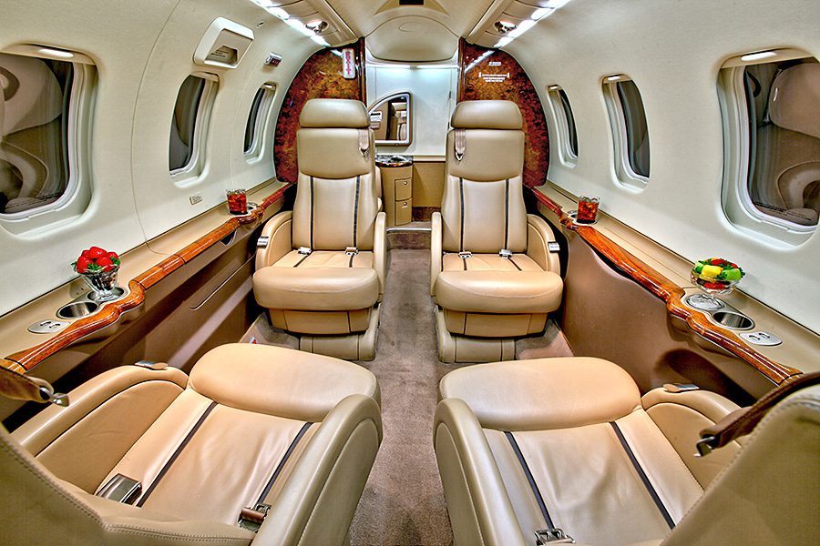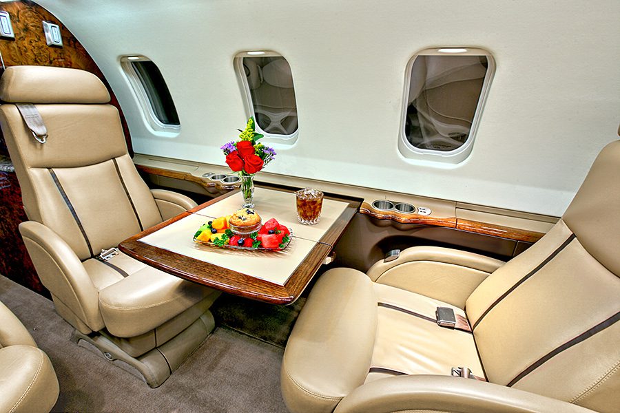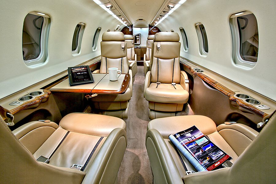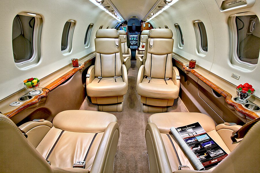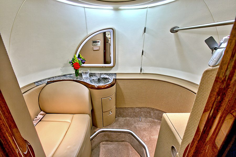 Double club configuration with aft belted lav. Complete soft goods refurbishment with partial re-veneer of forward cabinets in Birdseye Maple. Complete re-plating of all interior hardware in Brushed Nickel finish. New inner windows and window shades. Seats redone in Lear 45XR style with Tan and Brown leather. Carpet in Tan Medium Slate. Cockpit seats completed in Aristo Gray Sheepskin. Interior fireblocked per FAR Part 25 requirements. Includes the following features: 10.4″ Airshow 410 screen and system, four 110V AC outlets, sink, belted toilet.Refurbished April 2012 by Bombardier Tucson.