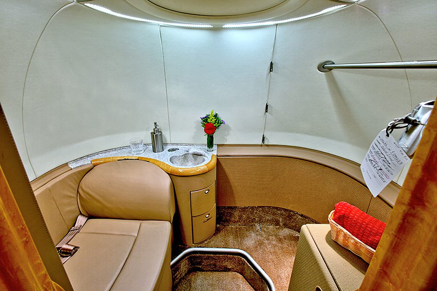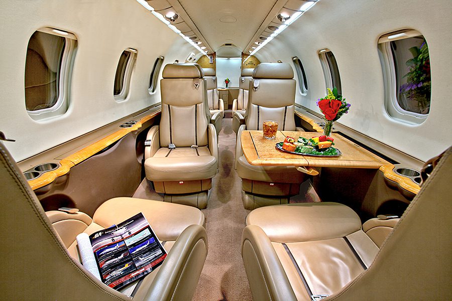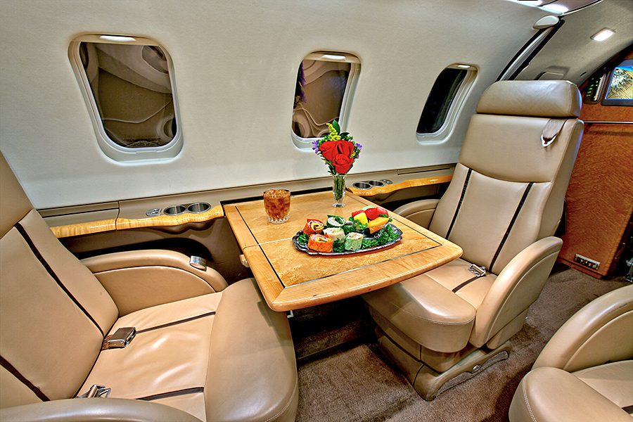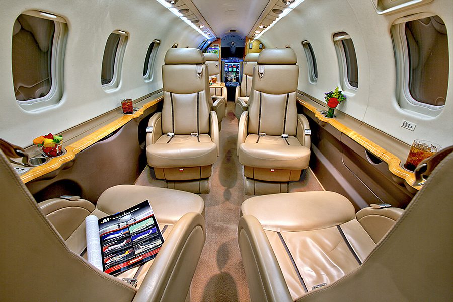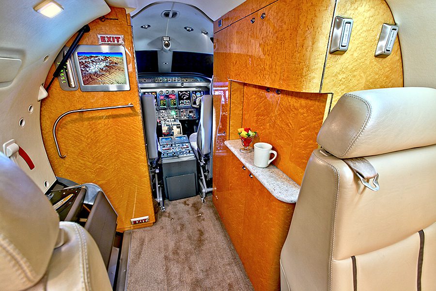 Double club configuration with aft belted lav. Complete soft goods refurbishment with partial re-veneer of forward cabinets in Birdseye Maple. Complete re-plating of all interior hardware in Brushed Nickel finish. New inner windows and window shades. Seats redone in Lear 45XR style with Tan and Brown leather. Carpet in Tan Medium Slate. Cockpit seats completed in Aristo Gray Sheepskin. Interior fireblocked per FAR Part 25 requirements. Includes the following features: 10.4″ Airshow 410 screen and system, four 110V AC outlets, sink, belted toilet.Refurbished April 2012 by Bombardier Tucson.