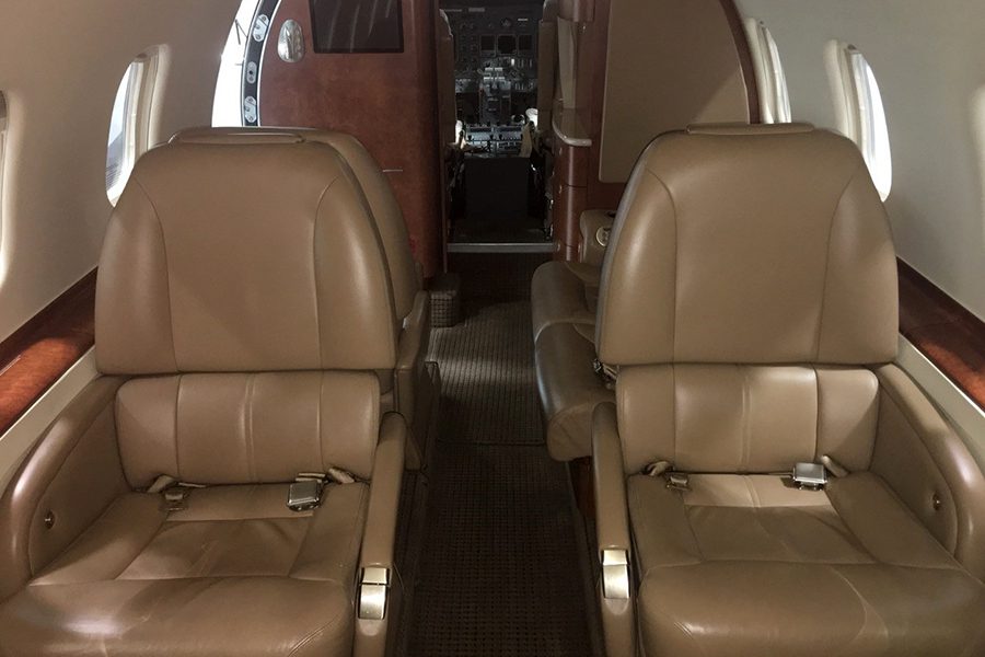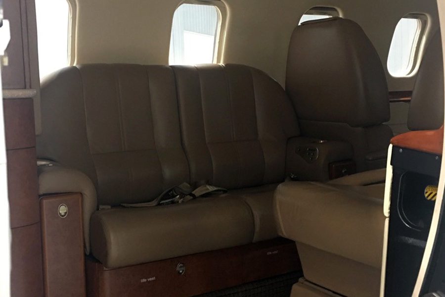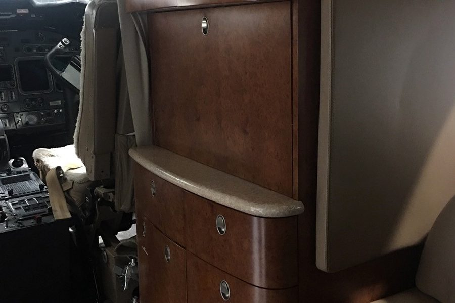 Eight passenger interior consisting of forward right side two-place divan opposite a single forward facing seat and aft four-place club arrangement. Forward right-hand galley with heated liquid container; 10 Disc CD with 15.1″ monitor; Airshow 400. Aft belted lavatory.